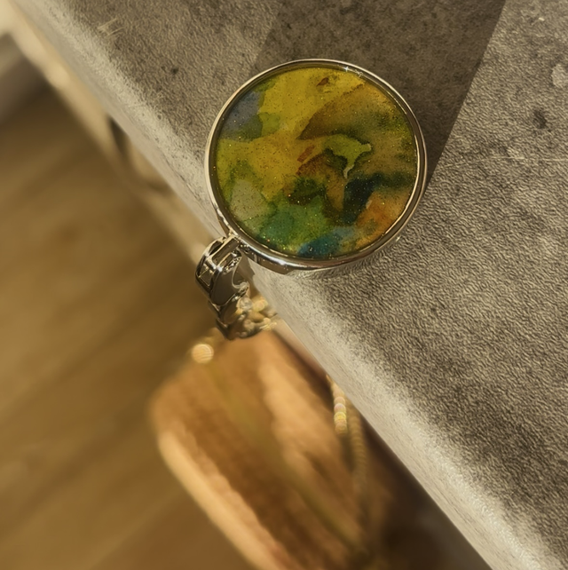 Materiaux : acier inoxydable / papier aquarelle original / résine UV / paillette
