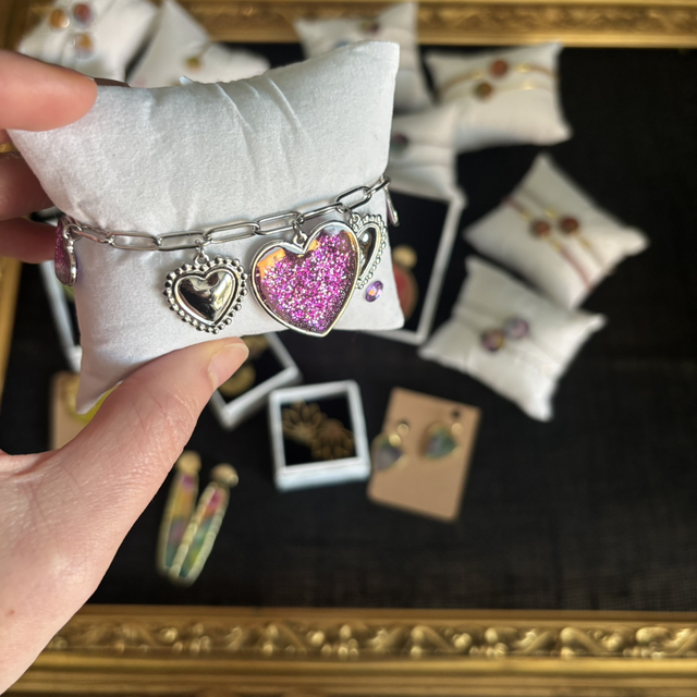 bracelet et sa chaîne d’extension, en acier inoxydable et paillettes rose fuchsia / violet