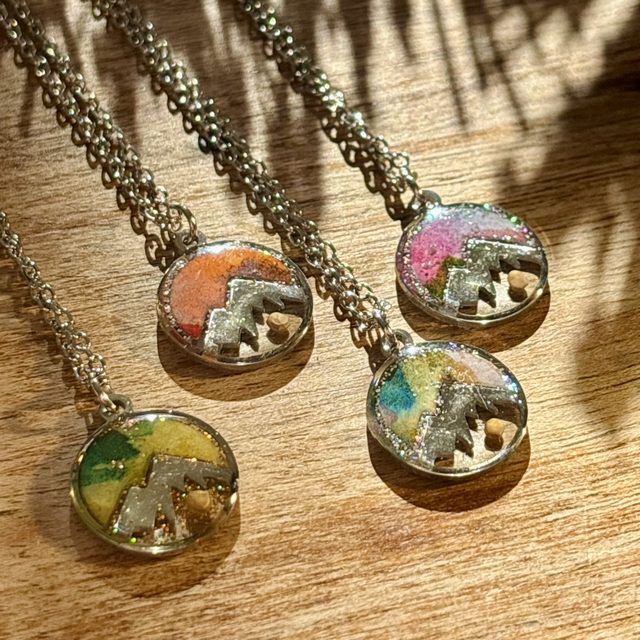 Collier avec son médaillon, au centre de la montagne est posée une graine de moutarde, peint à l’aquarelle par maman l’artiste de la marque. Au dos : paillettes argentées.