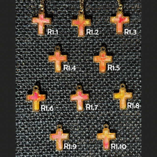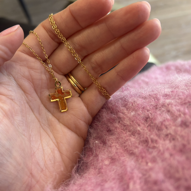 Collier avec sa petite croix peinte à l’aquarelle par maman l’artiste de la marque. Au dos : paillettes dorées.