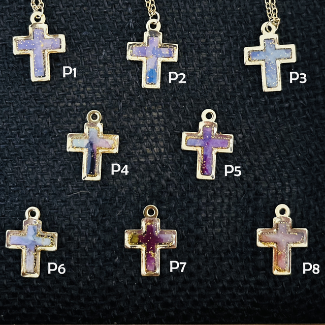 Collier avec sa petite croix peinte à l’aquarelle par maman l’artiste de la marque. Au dos : paillettes dorées.