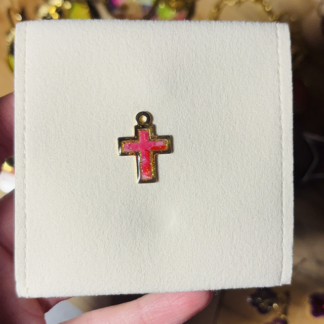 Collier avec sa petite croix peinte à l’aquarelle par maman l’artiste de la marque. Au dos : paillettes dorées.