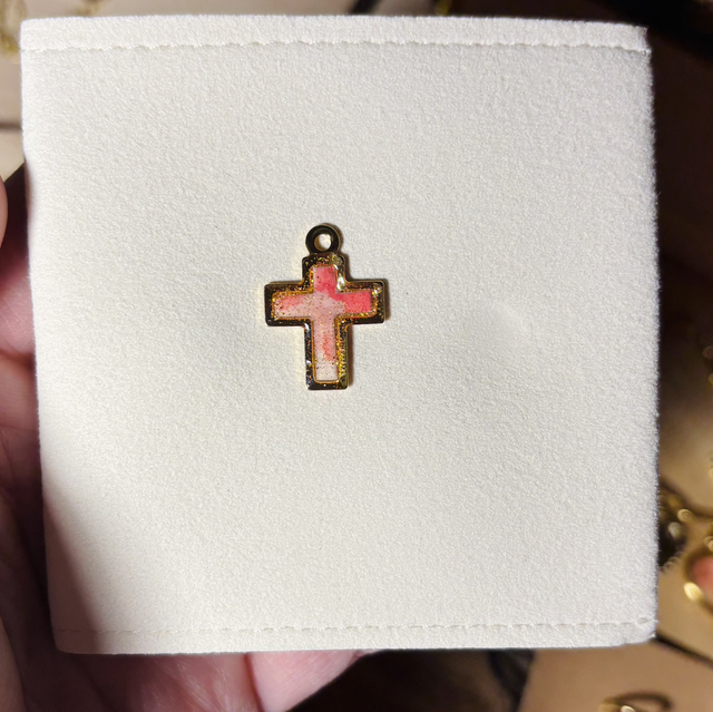 Collier avec sa petite croix peinte à l’aquarelle par maman l’artiste de la marque. Au dos : paillettes dorées.