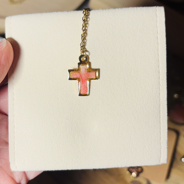 Collier avec sa petite croix peinte à l’aquarelle par maman l’artiste de la marque. Au dos : paillettes dorées.