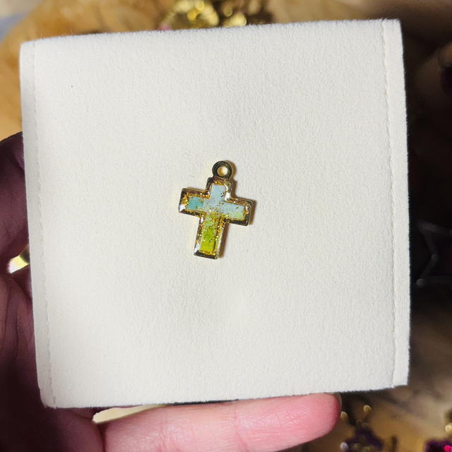 Collier avec sa petite croix peinte à l’aquarelle par maman l’artiste de la marque. Au dos : paillettes dorées.