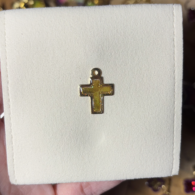 Collier avec sa petite croix peinte à l’aquarelle par maman l’artiste de la marque. Au dos : paillettes dorées.