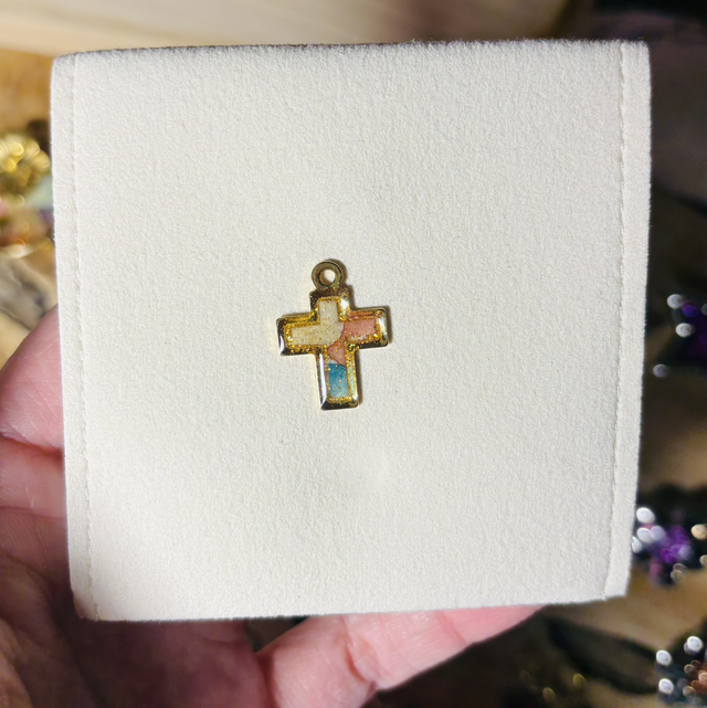 Collier avec sa petite croix peinte à l’aquarelle par maman l’artiste de la marque. Au dos : paillettes dorées.