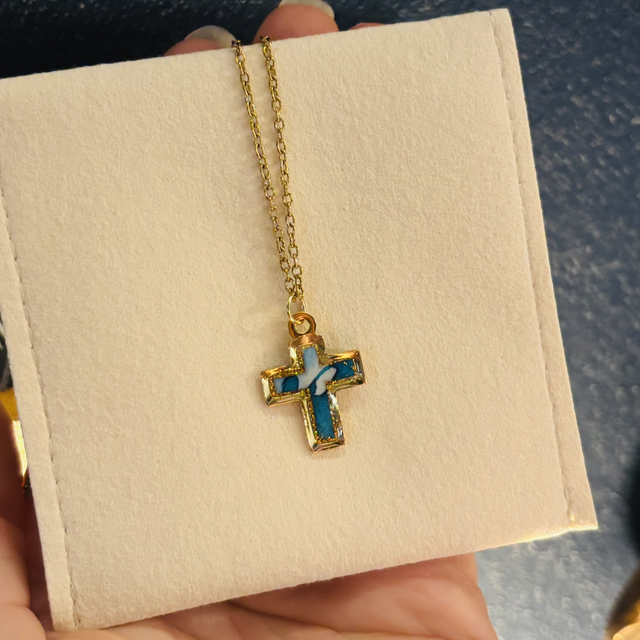 Collier avec sa petite croix peinte Ă l’aquarelle par maman l’artiste de la marque. Au dos : paillettes dorĂ©es.Â