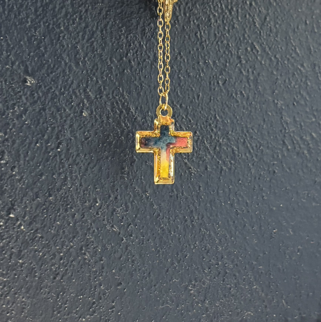 Collier avec sa petite croix peinte Ă l’aquarelle par maman l’artiste de la marque. Au dos : paillettes dorĂ©es.Â