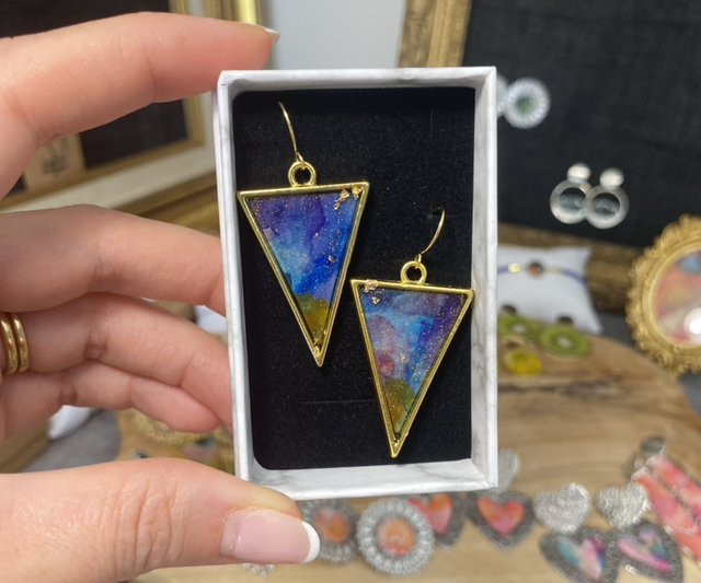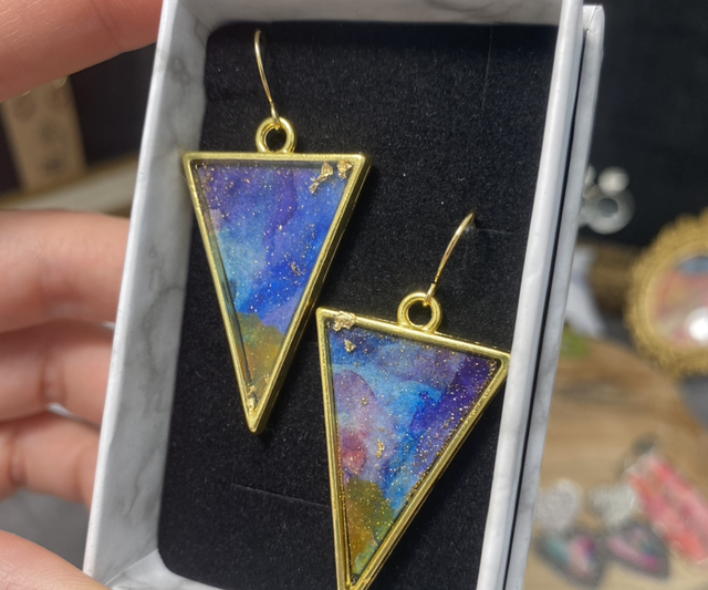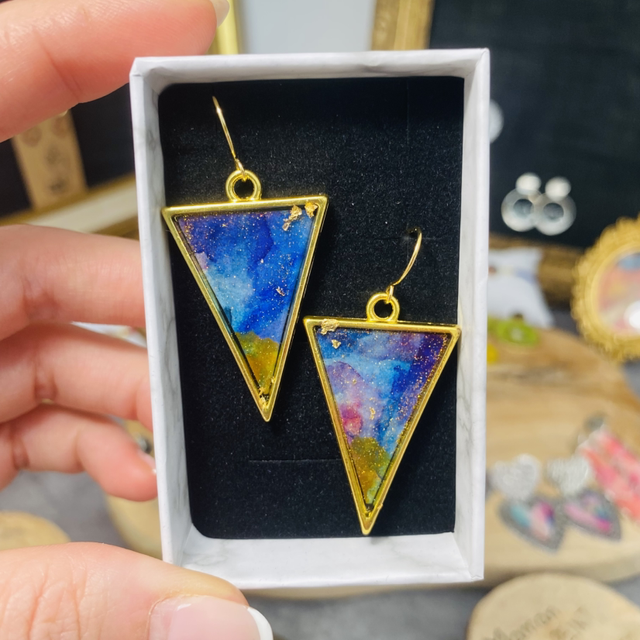 matériaux : aquarelle unique (non numérisée) / résine UV / feuilles d’or / paillettes / apprêt en laiton recouvert d’une fine couche de plaqué or.