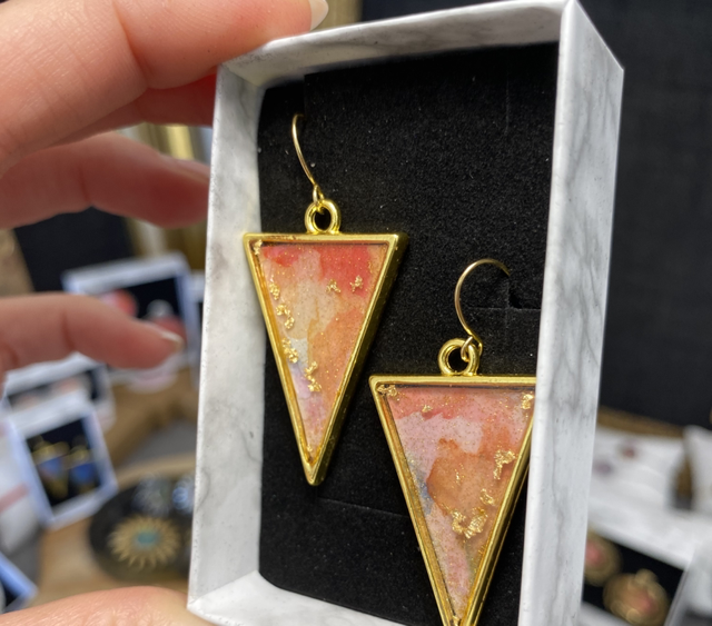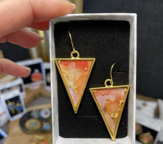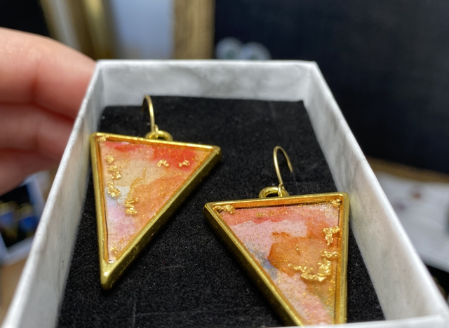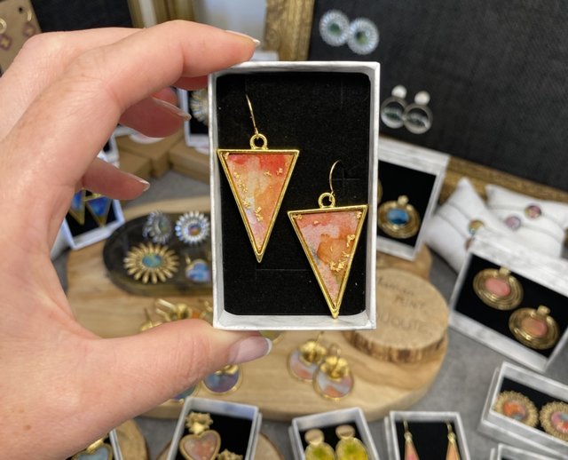 matériaux : aquarelle unique (non numérisée) / résine UV / feuilles d’or / paillettes / apprêt en laiton recouvert d’une fine couche de plaqué or.