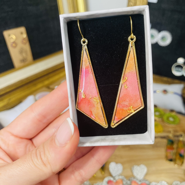 matériaux : aquarelle unique (non numérisée) / résine UV / feuilles d’or / paillettes / apprêt en laiton recouvert d’une fine couche de plaqué or.